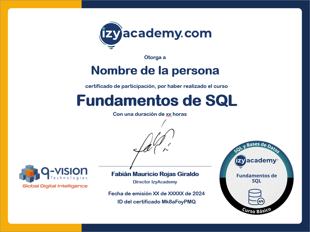 Este curso de fundamentos de SQL mediante sus 4 capítulos, busca brindar los conceptos necesarios para que el estudiante pueda crear bases de datos, consultar información, además de dar manejo estructurado a la información por medio del lenguaje SQL.